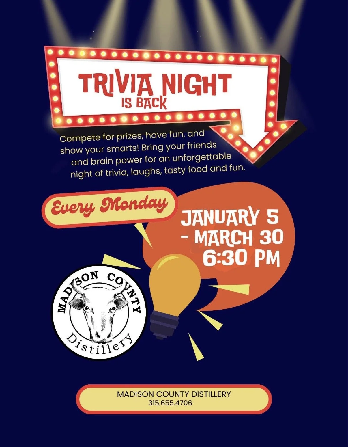 Think you’ve got what it takes? Grab your smartest friends (or the ones who think they’re smart) and join us for Monday Night Trivia at the distillery!